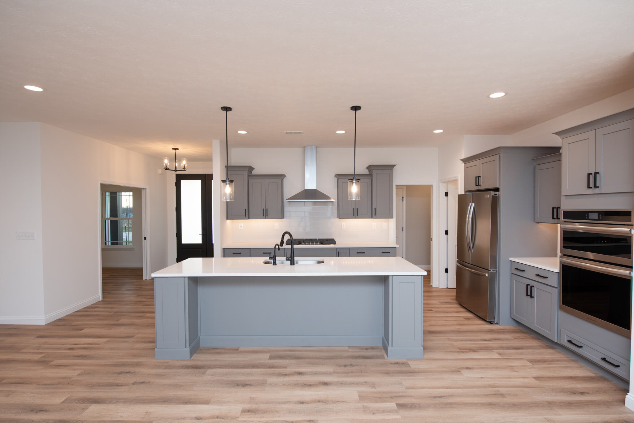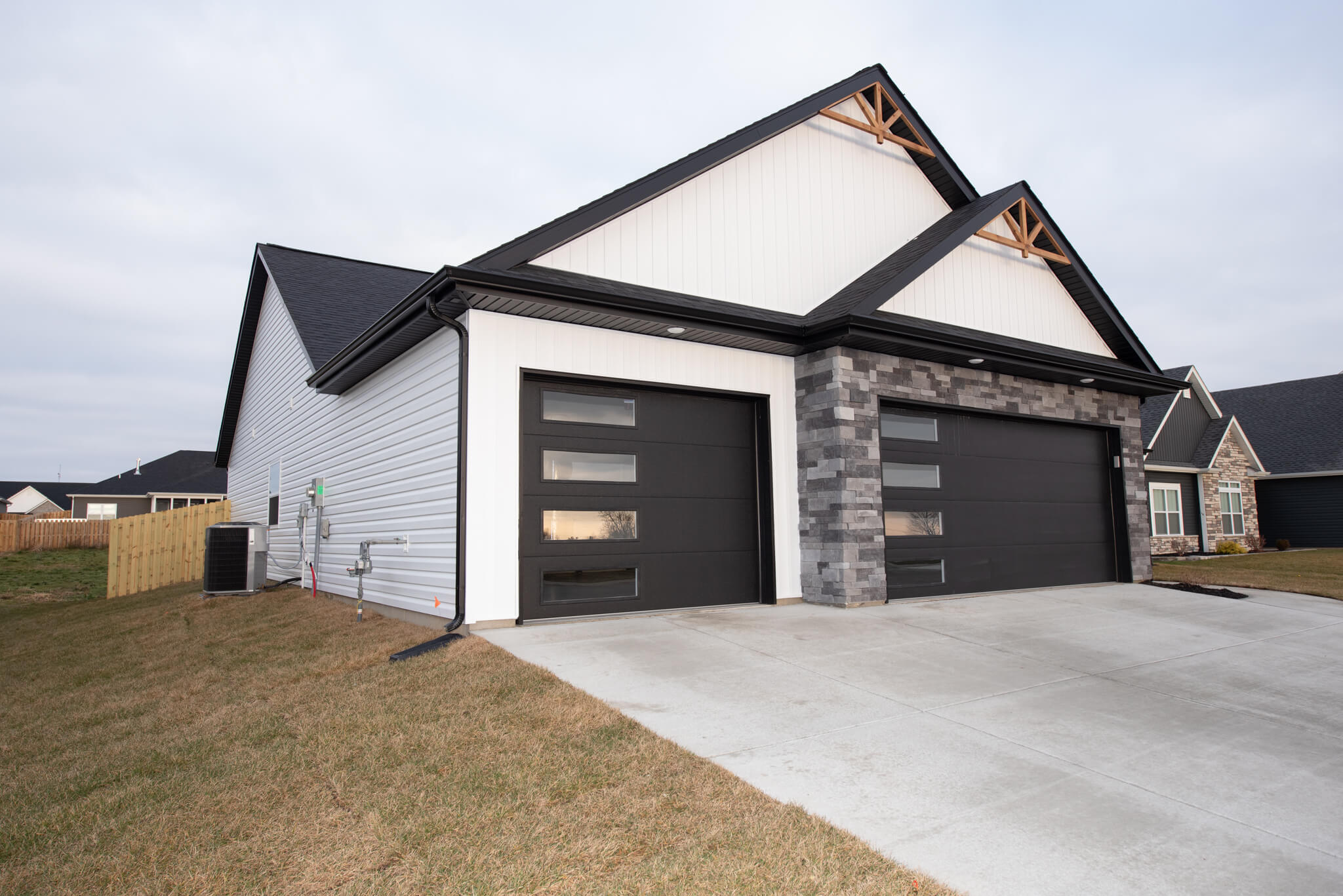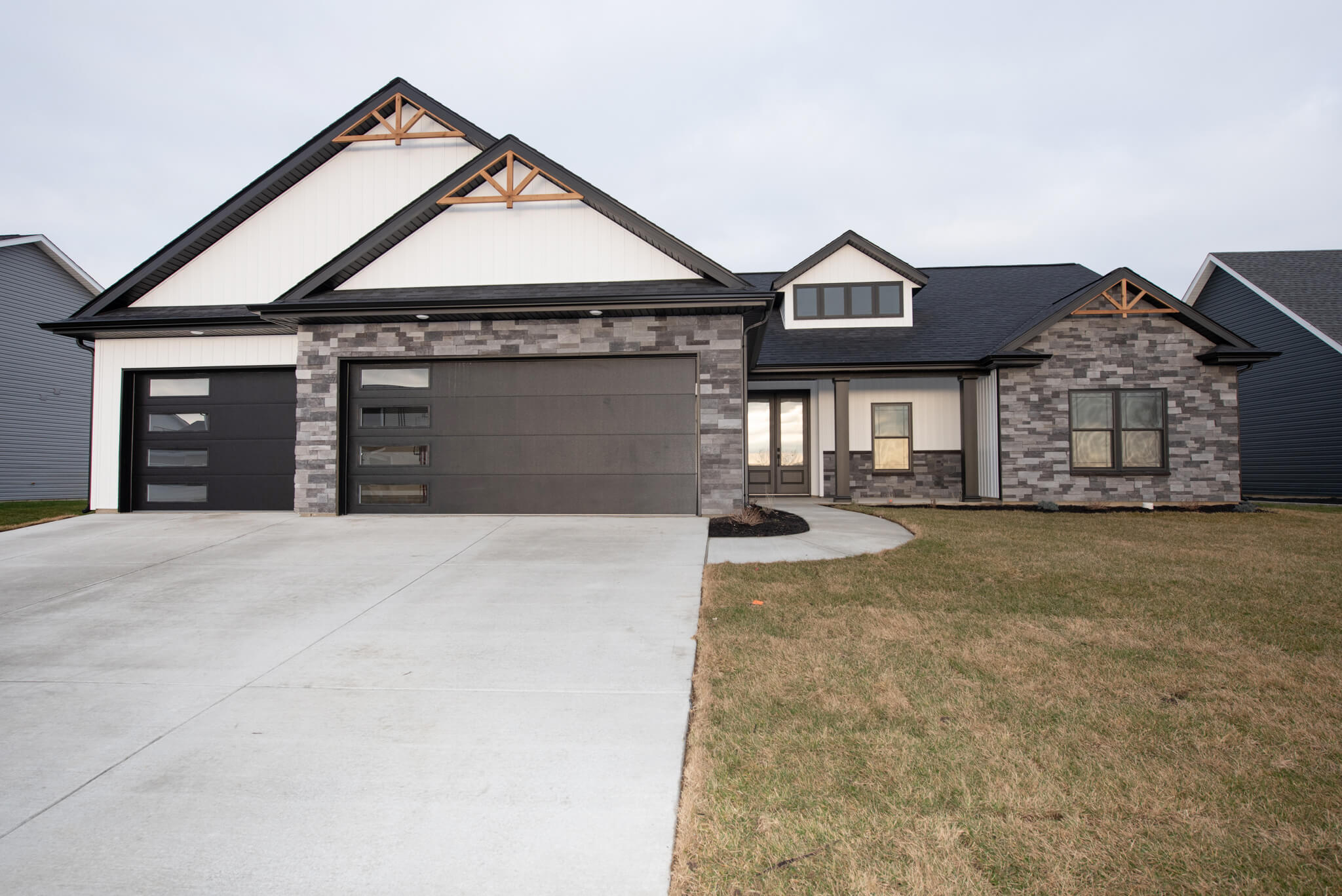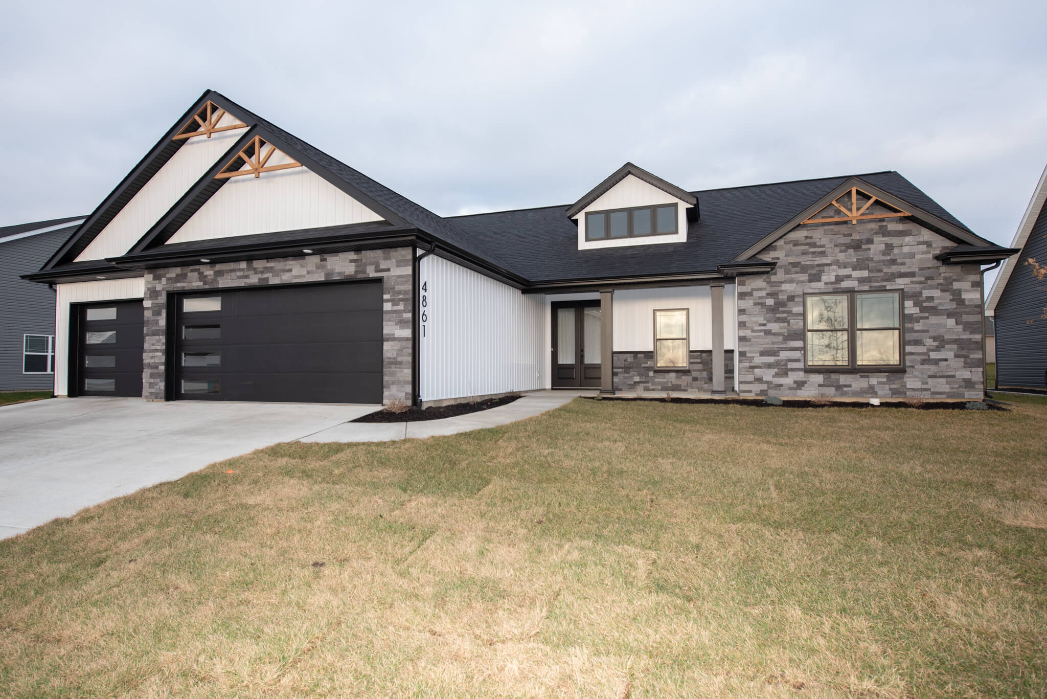 Three car garage, covered porch, mudroom, den, main floor master bedroom, walk-in pantry