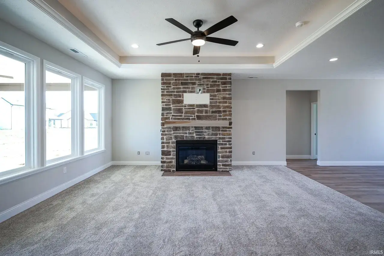 This thoughtfully crafted split floor plan offers 2, 189 square feet of open living space, featuring 3 bedrooms, 2 full baths, and a versatile den. A welcoming foyer entry sets the tone, leading into the impressive great room highlighted by a tray ceiling with crown molding and lighting, a custom fireplace with detailed surround and mantel, and three large windows that overlook the 16x14 covered porch. The gourmet kitchen seamlessly connects to the expansive dining area and boasts custom soft-close cabinetry, stainless steel appliances, a tiled backsplash, under-cabinet lighting, a walk-in pantry, and a 9-foot island with bar seating, perfect for entertaining.