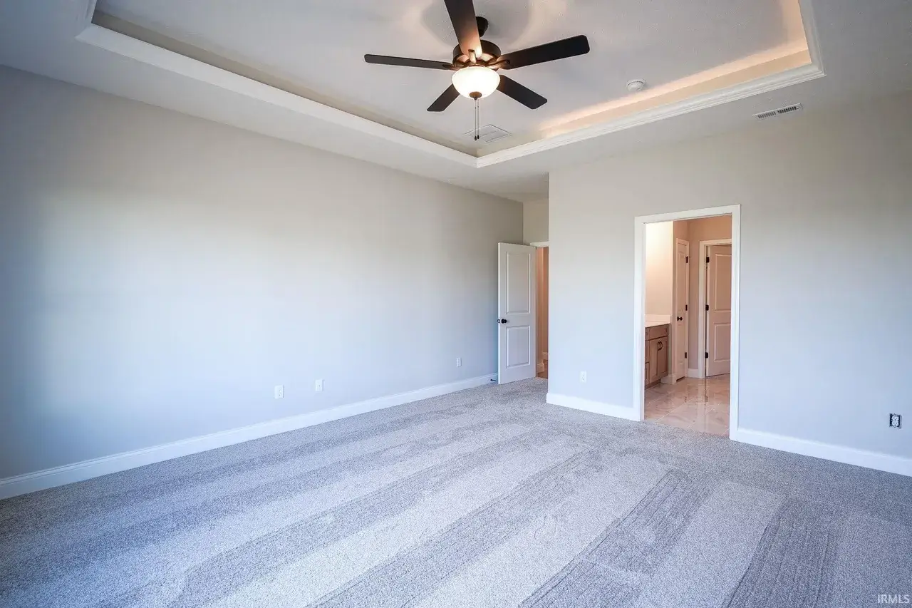 French doors open to the private office with closet, while the luxurious primary suite offers its own tray ceiling with crown molding and lighting, a spa-inspired ensuite bath with dual sinks and a custom tiled walk-in shower, and a spacious walk-in closet that connects directly to the laundry room with cabinetry, folding area, and mudroom with built-in cubbies and closet. Two additional bedrooms share a full bath, providing comfort and flexibility for family or guests. Completing this home is an oversized three-car garage with pull-down attic storage, a full yard irrigation system, and included water softenercombining elegance, function, and convenience in one exceptional package.